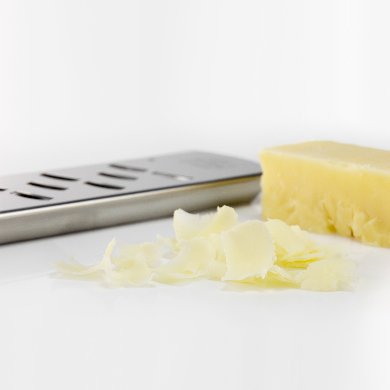 Nieuw in ons gamma is deze inox rasp met platte brede scherpe mesjes. Ideaal voor het raspen van harde kazen. Bvb. parmezaanse kaas voor bij de carpaccio of op de spaghetti.